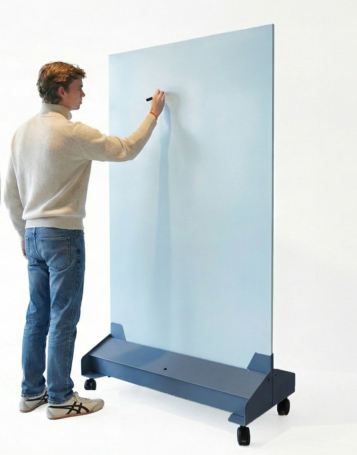 > SNIP: Een portable whiteboard dat tegen de muur, op tafel of op de grond kan worden geplaatst, met wieltjes.