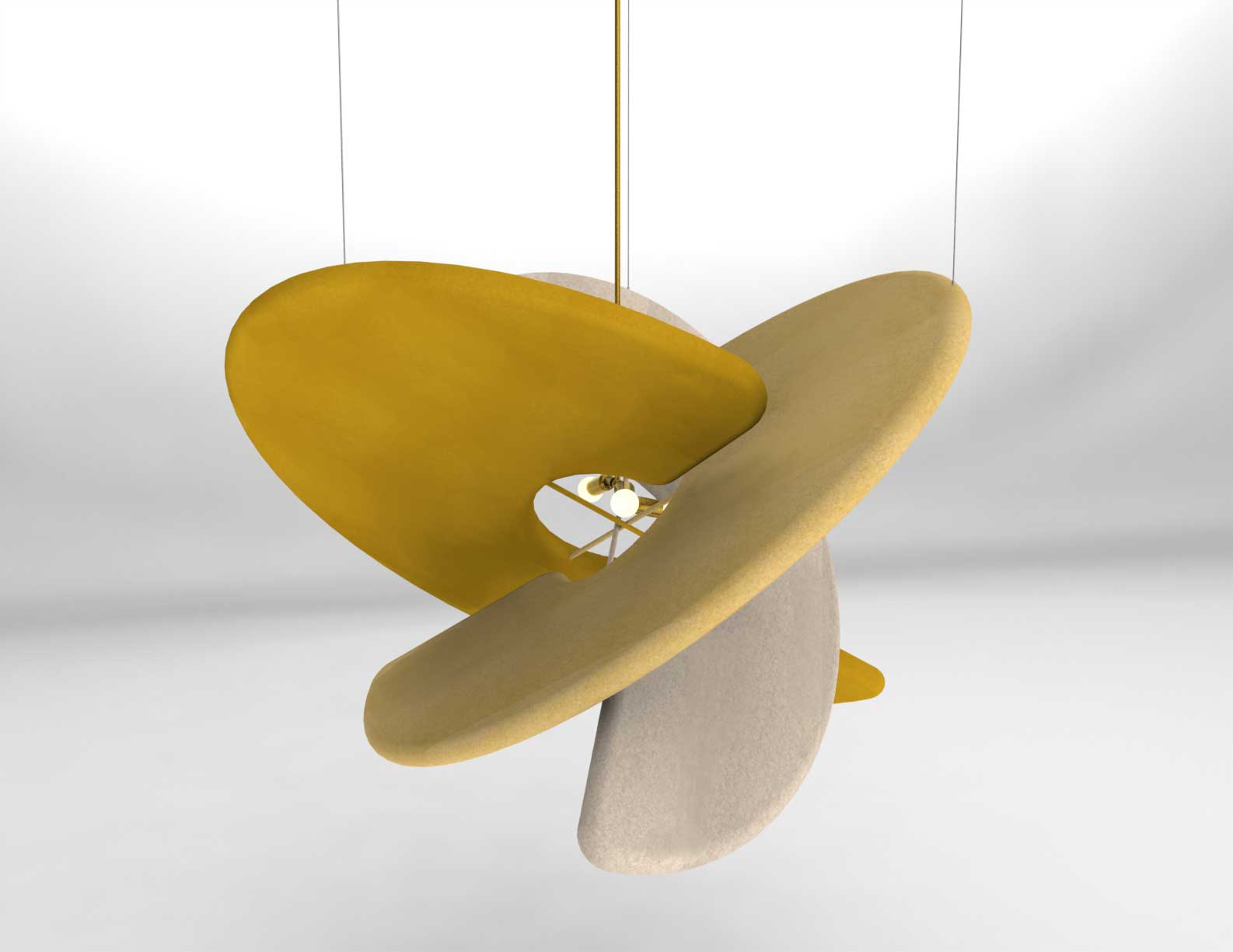 Voor hoge ruimtes om galm te verminderen. Een decoratief akoestisch object die het rond zingend geluid in ruimtes opvangt. Een iconische eye catcher die je ziet gelijk als je de ruimte binnenkomt, vriendelijk, speels en uitnodigend. Gesneden uit akoestisch wol en bekleed met vilt, geeft deze akoestische lamp een warm comfort gevoel aan elke ruimte.